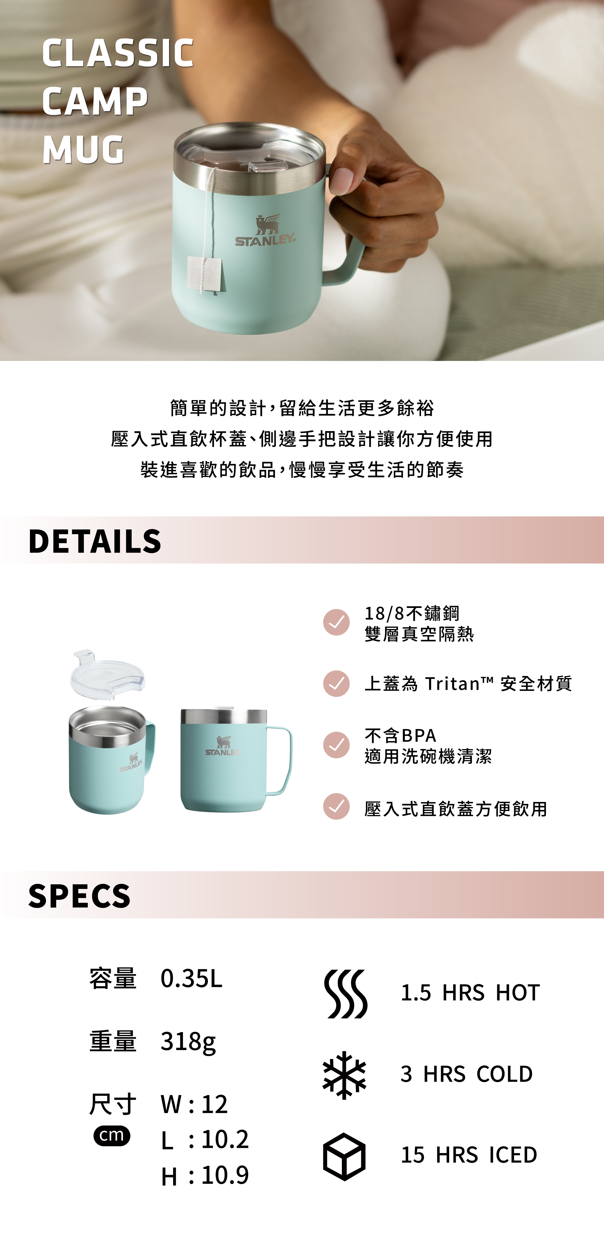 上蓋為 Tritan™ 安全材質,壓入式直飲蓋,方便飲用