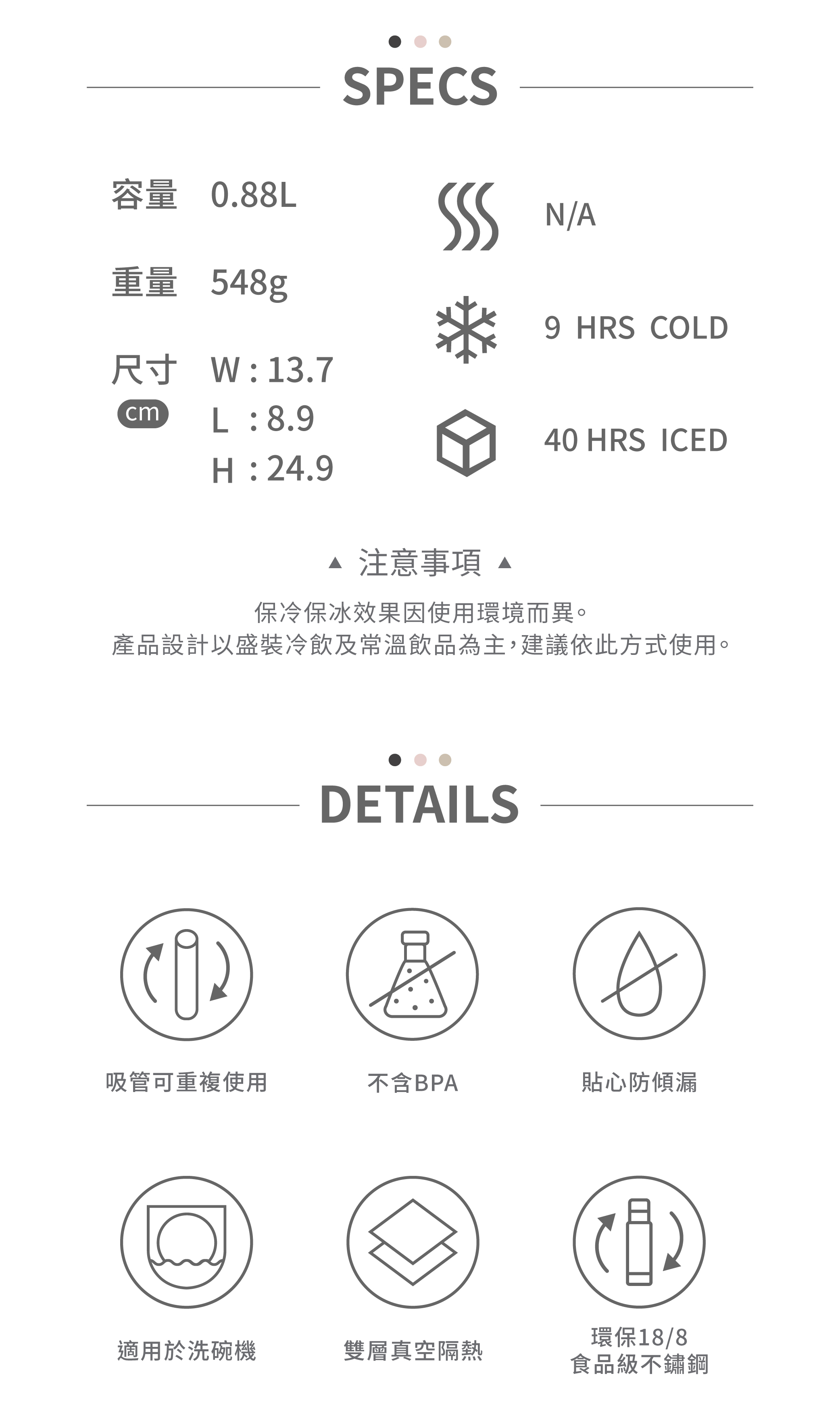 杯身: 18/8 (304) 食品級不銹鋼, 不含 BPA