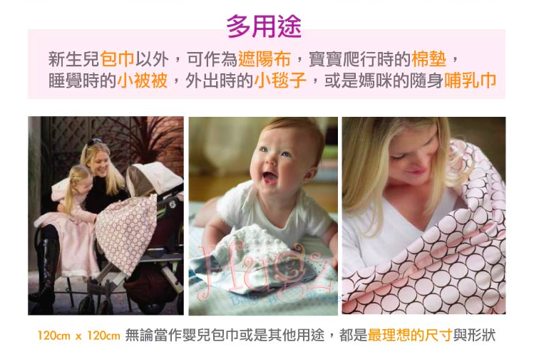 • 多用途,可作為遮陽布,寶寶爬行時的棉墊,或是媽咪的隨身哺乳巾