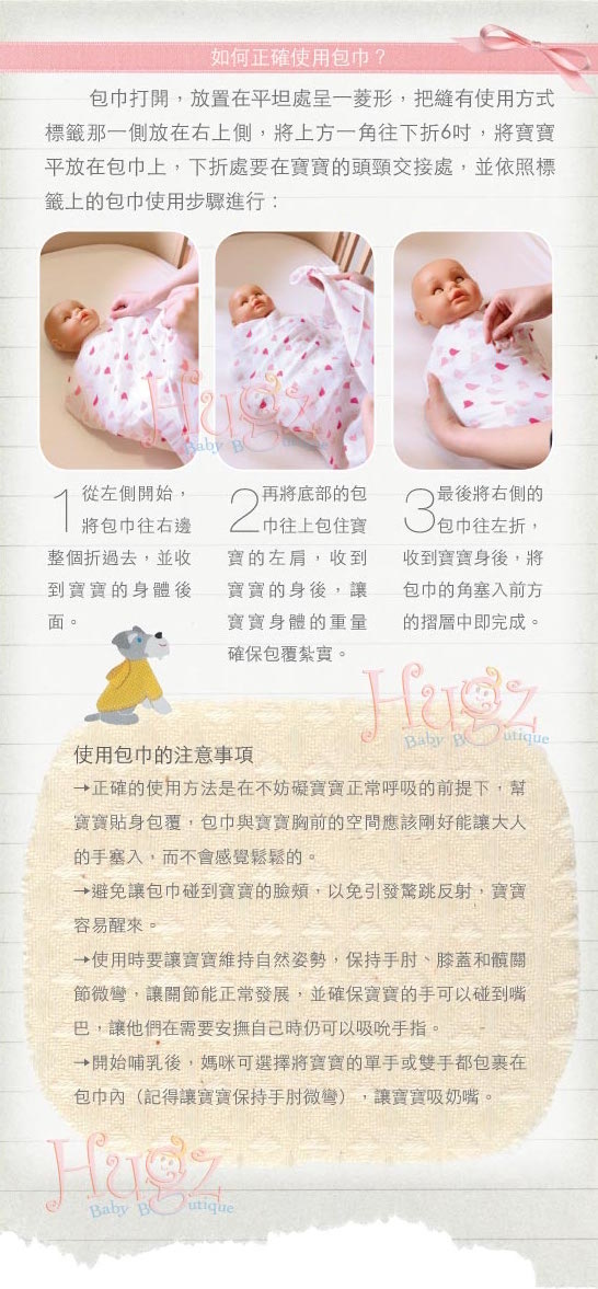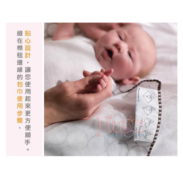 • 縫在棉毯邊緣的包巾使用步驟,貼心設計,讓您使用起來更方便順手