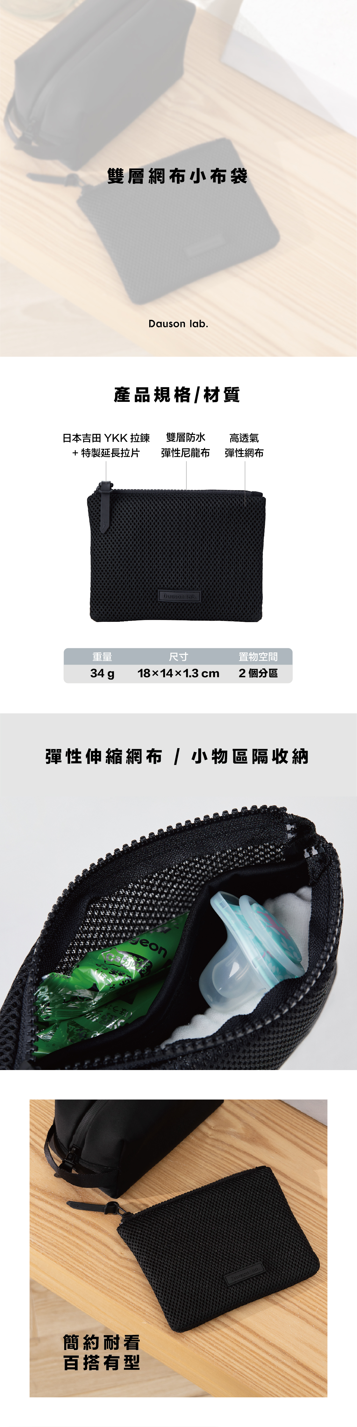針對小型物品分類收納,如奶嘴、手帕、藥物等,利用彈性多層次網布做到可伸縮體積效果,不浪費包內空間